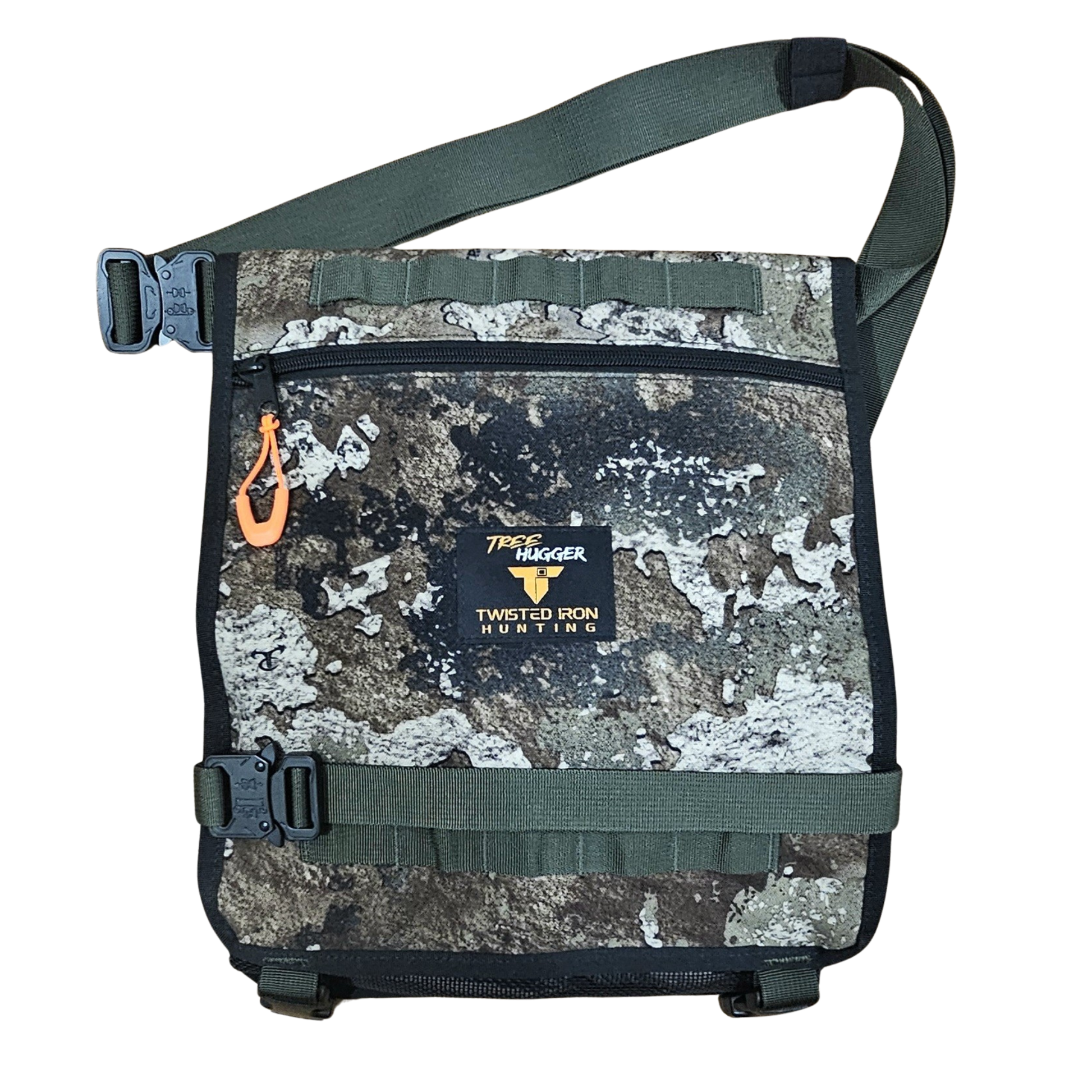 The Tree Hugger is our gear pack for hunters needing a little bit more storage than the minimalist BBPRO pack offers. The pack design allows the top flap to remain open on the tree, resulting in twice the storage capacity of the BB PRO. The pack's pouch-style pockets enable efficient organization and swift access to gear. Molle webbing is present throughout for potential extra storage customization.