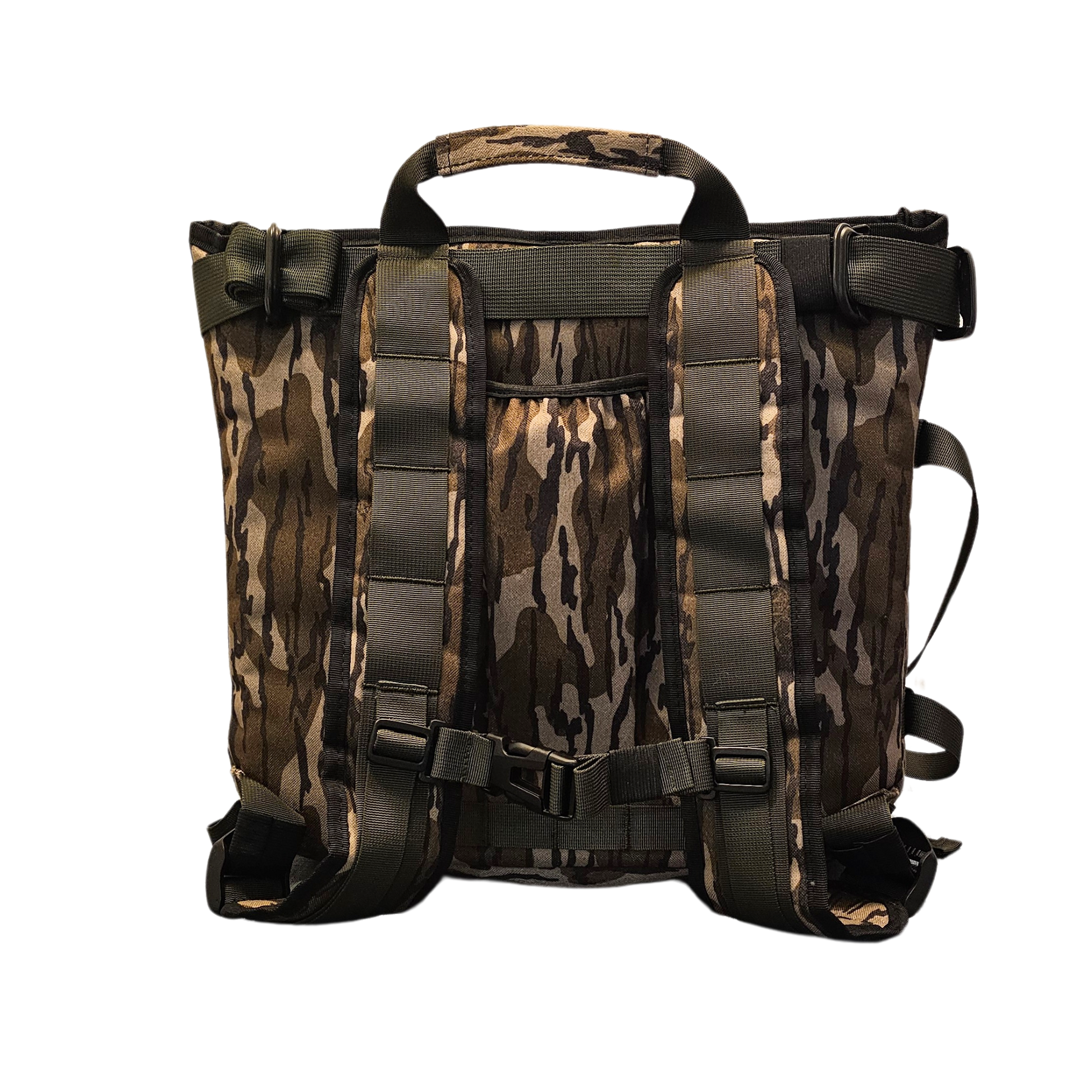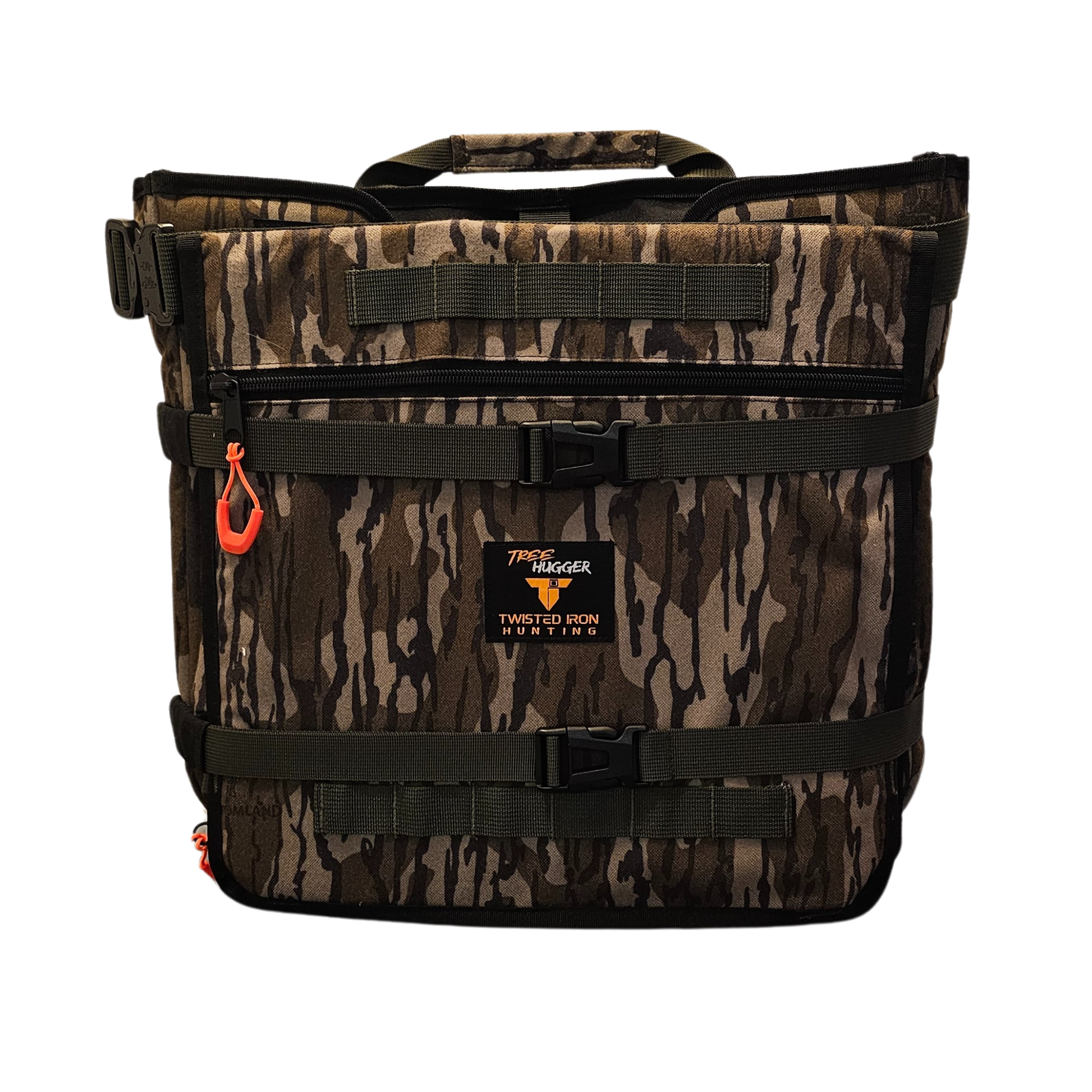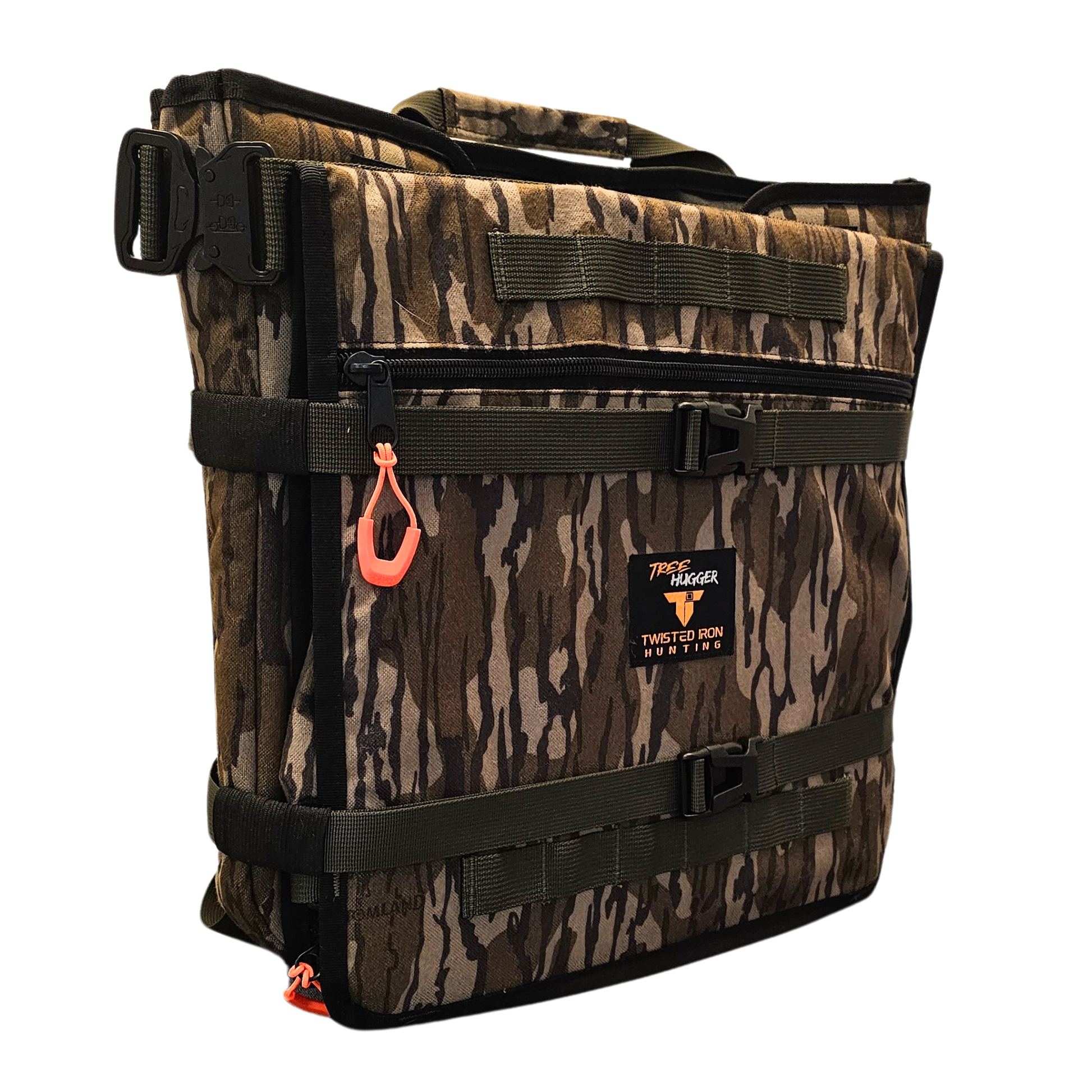 The Tree Hugger is our gear pack for hunters needing a little bit more storage than the minimalist BBPRO pack offers. The pack design allows the top flap to remain open on the tree, resulting in twice the storage capacity of the BB PRO. The pack's pouch-style pockets enable efficient organization and swift access to gear. Molle webbing is present throughout for potential extra storage customization.